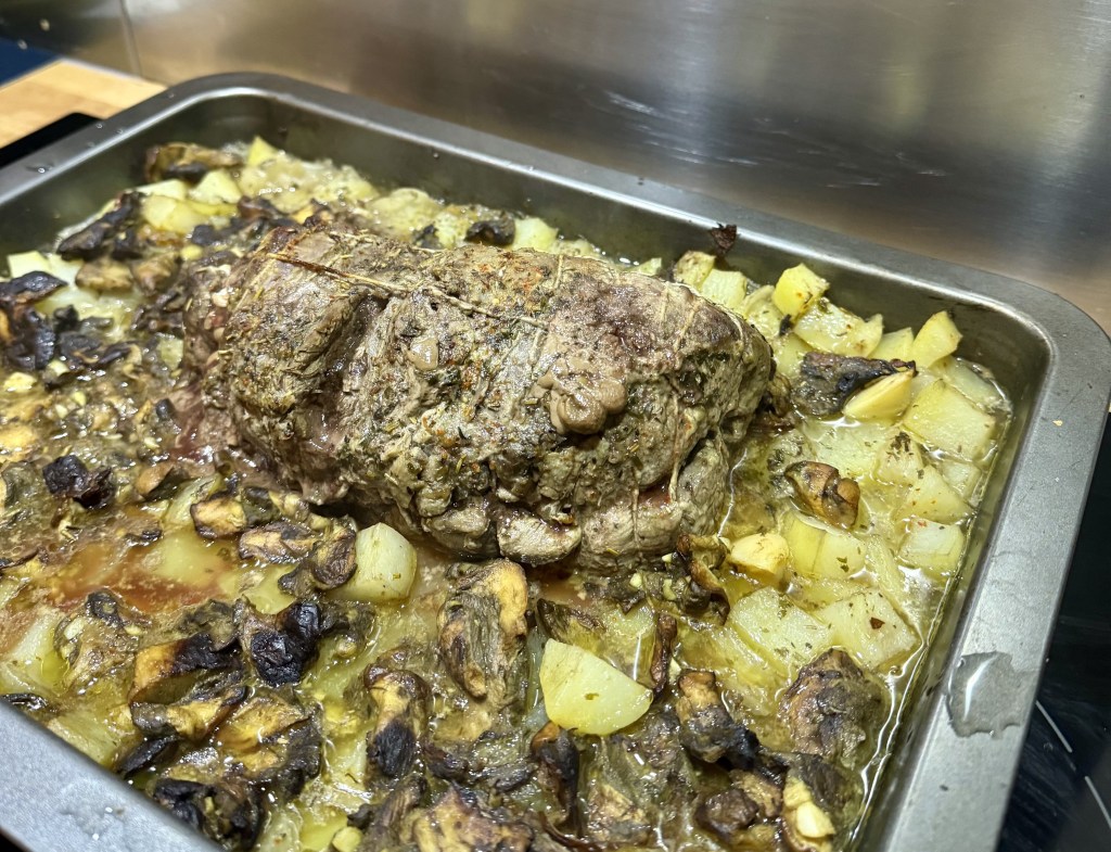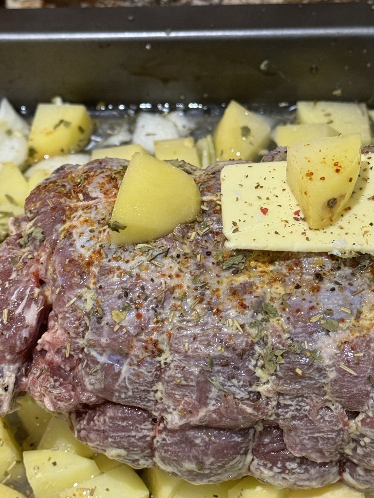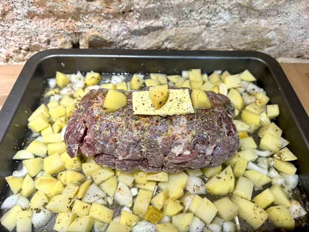 - Déposer le rôti sur le lit de pommes de terres, oignons et échalotes.